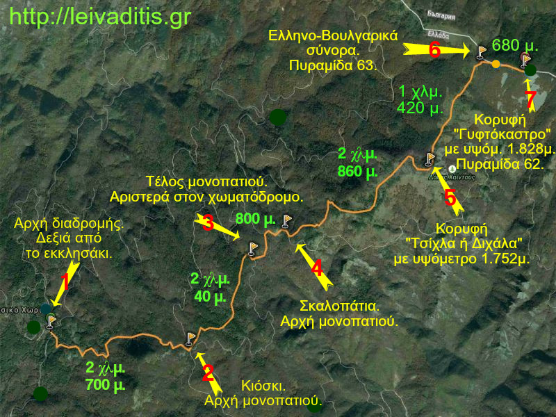 Από την διασταύρωση και μετά συνεχίζετε πάνω σε ευδιάκριτο μονοπάτι για άλλο 1 χιλιόμετρο και 820 μέτρα περπατάτε δηλαδή άλλα 25 λεπτά και θα αρχίσετε να πλησιάζετε στα σύνορα με την Βουλγαρία. Αυτό θα το καταλάβετε από τις λεγόμενες πυραμίδες που παλιά ήταν το διακριτικό των συνόρων και των δύο χωρών. Οι πυραμίδες υπάρχουν ακόμη, και την πρώτη θα την συναντήσετε μέσα σε δασομένο μονοπάτι. Μόνο που θα πρέπει να προσέξετε γιατί θα πρέπει να βγείτε κάποια στιγμή από το κεντρικό μονοπάτι και να πάτε δεξιά πάνω σε μικρό δασάκι. Ένα μικρό δέντρο μόνο του, πάνω στο μονοπάτι θα σας υποδείξει πότε θα πρέπει να στρίψετε και όταν το κάνετε αυτό, στο βάθος θα δείτε την ύπαρξη κόκκινων σημαδιών τα οποία θα σας υποδείξουν πως συνεχίζει το μονοπάτι.