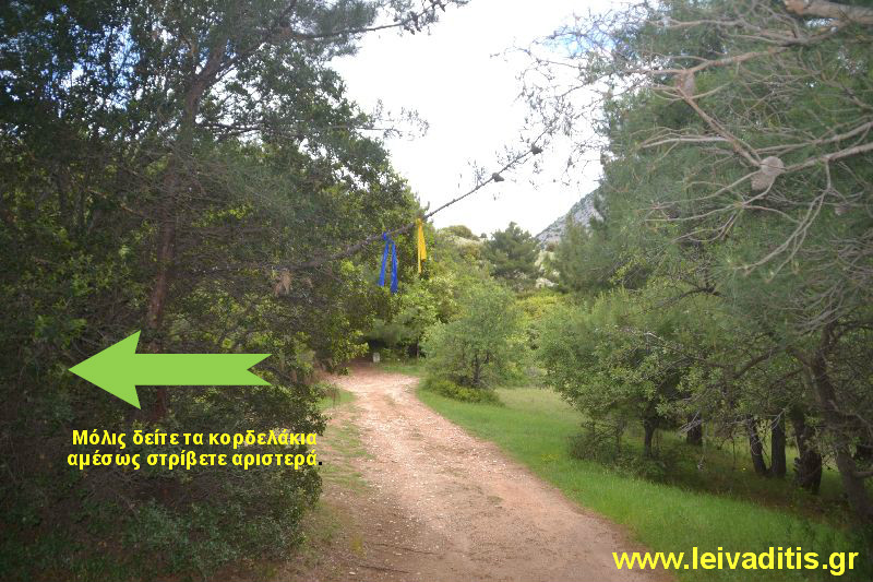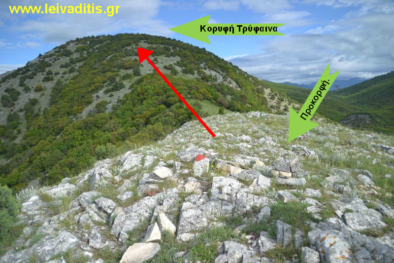 Στα πρώτα 100 μέτρα που θα περπατήσετε πάνω στον αγροτικό δρόμο θα δείτε και την σήμανση που θα σας καθοδηγεί μέχρι την κορυφή που επιλέξατε να εξερευνήσετε στην σημερινή σας περιπέτεια. Κορδελάκια διαφόρων χρωματισμών και σχημάτων τα οποία έχουν τοποθετήσει δύο λάτρεις των ορεινών μας, ο Δήμος Αναστασιάδης και ο Λάζαρος Τσάλης που μαζί με την κόκκινη μπογιά που έχει τοποθετήσει ο κ. Νίκος Σουμάδης πάνω στις πέτρες αποτελούν μία σήμανση άριστη για την διαδρομή και σε κανένα σημείο δε θα σας αφήσουν με την απορία αν είστε στην σωστή διαδρομή ή όχι. Αυτού του είδους η σήμανση υπάρχει μέχρι λίγο πιο κάτω από την κορυφή της Τρύφαινας. Όταν θα στρίψετε δεξιά για να βρείτε την λαμαρινένια παράγκα πυ αναφέρουμε πιο κάτω και μέχρι λίγο πριν την κορυφή Στ. Τσακίρης η διαδρομή δεν έχει σήμανση αλλά ακολουθώντας τις οδηγίες που σας δίνουμε καθώς και αν έχετε την διαδρομή αποθηκευμένη στο κινητό σας, δεν θα έχετε πρόβλημα και θα την πραγματοποιήσετε άνετα και χωρίς ιδιαίτερο πρόβλημα. Μόλις εντοπίσετε αυτά τα κορδελάκια λοιπόν, στρίβετε αριστερά για να βρείτε την πλαγιά και να αρχίσετε να ανεβαίνετε προς την κορυφή (Εικόνα 4)...