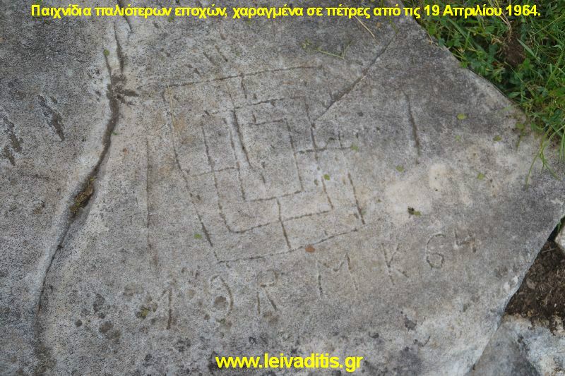 Αν είστε τυχεροί και παρατηρητηρικοί θα περάσετε και από έναν βράχο που έχει σχεδιασμένο επάνω του, μάλλον κάποιο παιχνίδι (τρίλιζα ίσως) αλλά χαρακτηριστική είναι η ημερομηνία που είναι χαραγμένη 19 Απριλίου 1964 (Εικόνα 14).