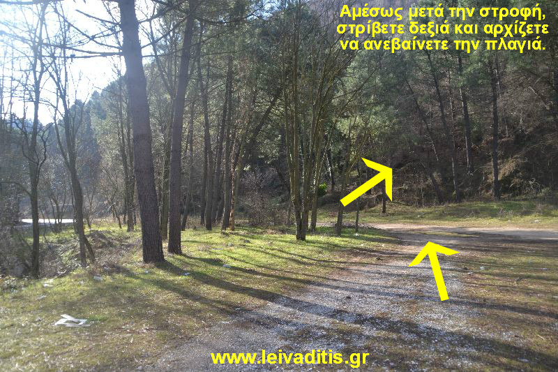 ...και στρίβετε δεξιά στην πλαγιά που υπάρχει μπροστά σας, καθότι εκεί βρίσκεται το μονοπάτι που θα σας οδηγήσει στον οικισμό του "Μακάριου". Μέχρι εδώ έχετε περπατήσει 4 χιλιόμετρα σε 1 ώρα και 10 λεπτά και βρίσκεστε σε υψόμετρο 115 μέτρων (Εικόνα 13)...