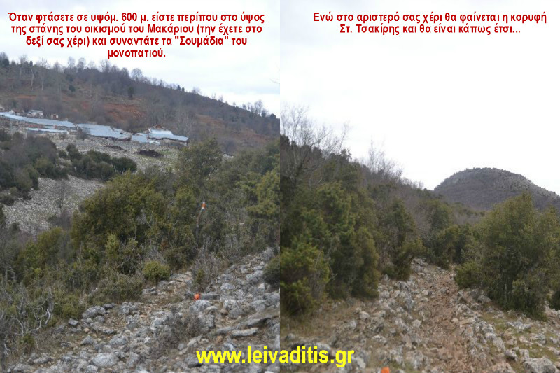 Η σημερινή σας περιπέτεια όμως δεν έχει τελειώσει. Επόμενος στόχος σας είναι η δεύτερη κορυφή της διαδρομής αυτή του Στ. Τσακίρη με υψόμετρο 665 μ. Φεύγετε λοιπόν αριστερά από το ορόσημο και αρχίζετε να κατεβαίνετε για να βρείτε τα "Σουμάδια" που θα σας οδηγήσουν στον επόμενο στόχο σας. Θα κατέβετε περίπου 100 υψομετρικά και όταν φτάσετε στο ίδιο επίπεδο με την στάνη του Μακάριου, θα την έχετε στο οπτικό σας πεδίο στα δεξιά σας, θα βρείτε τα "σουμάδια" και από εκείνο το σημείο και μετά στρίβετε αριστερά και τα ακολουθείτε (Εικόνα 19)...