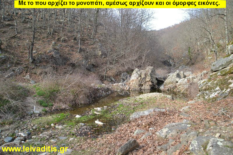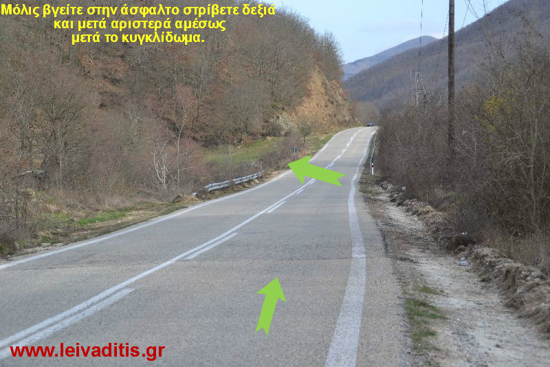 Μετά από 700 μέτρα πάνω στον τσιμεντένιο δρόμο φτάνετε στην παλιά Ε.Ο. Ξάνθης Δράμας. Βγαίνετε στον κεντρικό, στρίβετε δεξιά προς Ξάνθη και στην απέναντι μεριά του δρόμου (περίπου 50 μέτρα πιο κάτω) θα δείτε μικρό κυγκλίδωμα το οποίο μόλις περάσετε στρίβετε αριστερά στην πλαγιά για να βρείτε το μονοπάτι και να ξεκινήσετε αυτήν την πολύ όμορφη διάσχιση που έχετε βάλει στο μυαλό να κάνετε (Εικόνα 4)...