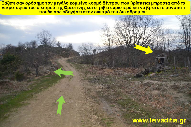 Πάνω σε αυτόν τον αγροτικό δρόμο συνεχίζετε να περπατάτε για άλλα 2 χιλιόμετρα και 300 μέτρα τα οποία θα χρειαστείτε 30 περίπου λεπτά περπατήματος για να φτάσετε στο παλιό νεκροταφείο του οικισμού της Ορεστινής σε υψόμετρο 660 μέτρων. Το κουφάρι ενός μεγάλου κομένου δέντρου ακριβώς μπροστά στα νεκροταφεία σας υποδυκνύει ότι πρέπει να αφήσετε τον αγροτικό δρόμο και να στρίψετε αριστερά για να βρείτε το μονοπάτι που θα σας οδηγήσει στον οικισμό του Λυκοδρομίου (Εικόνα 15)...