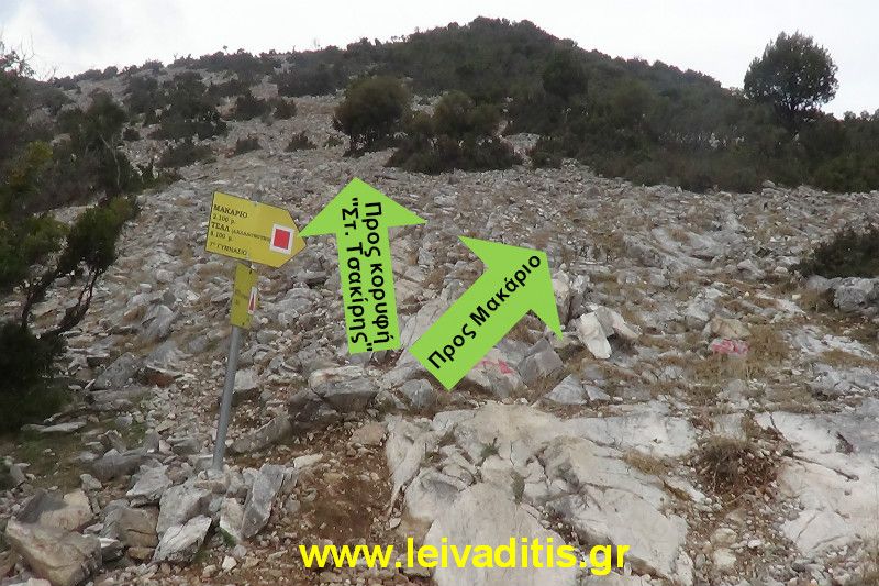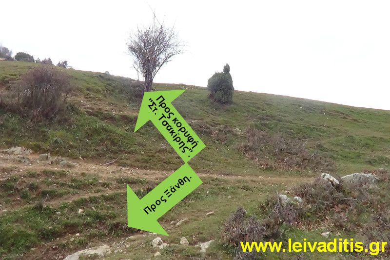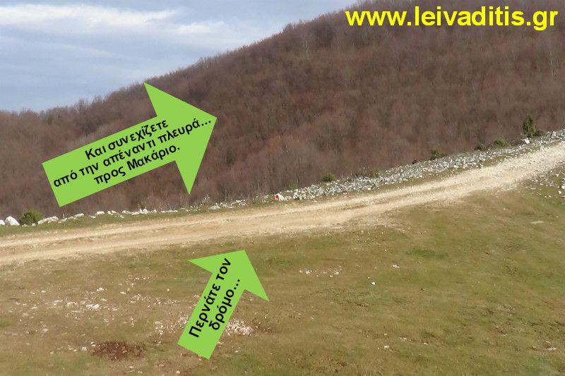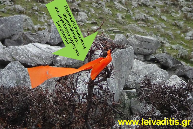 Για την επόμενη ώρα το μόνο που θα σας απασχολεί θα είναι η κλίση. Περπατάτε σε μια διαδρομή η οποία είναι πολύ καλά σηματοδοτημένη από τον Νίκο τον Σουμάδη με κόκκινη μπογιά σε δέντρα και πέτρες, ενώ πάνω στα κλαδιά υπάρχουν πορτοκαλί πανάκια τα οποία εδώ και λίγες μέρες (Δεκέμβριος του 2015) έχουν τοποθετηθεί από τον Δημοσθένη Αθανασιάδη και την παρέα του. Σε κάποια στιγμή και αφού έχετε περπατήσει 2 περίπου χιλιόμετρα (σε υψόμετρο 850 μέτρων) θα φτάσετε σε ένα σημείο στο οποίο τελειώνουν τα σημάδια και τα πανάκια (προς το παρών) και θα πρέπει να συνεχίσετε αριστερά σας, πάνω στην κορυφογραμμή.