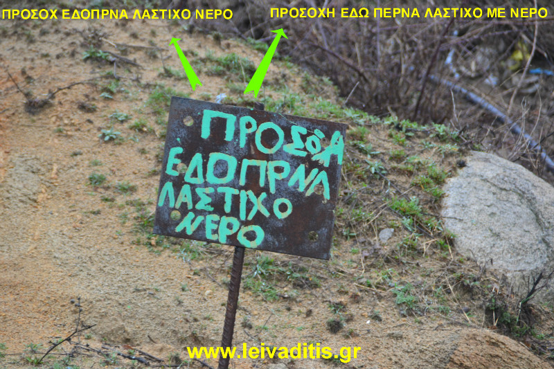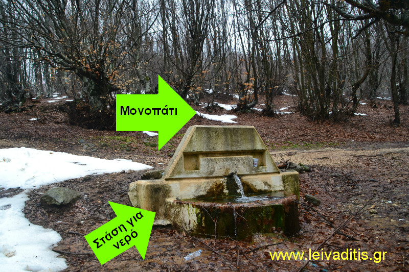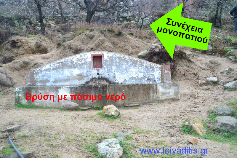 Στο χιλιόμετρο περπατήματος και ενώ έχουν περάσει 25 λεπτά, σε υψόμετρο 235 μέτρων, θα συναντήσετε βρύση με τρεχούμενο πόσιμο νερό. Όσοι δεν είστε καλά εφοδιασμένοι, τώρα έχετε την ευκαιρία να το κάνετε και να πιείτε ή να δροσιστείτε (ανάλογα με την εποχή που περπατάτε). Να σημειώσουμε ότι το βουνό έχει νερά τρεχούμενα και βρύσες αρκετές αλλά δεν τρέχουν όλες.