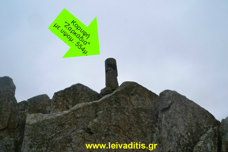 Αφού δροσιστείτε λοιπόν, συνεχίζετε το περπάτημά σας αριστερά από τη βρύση. Κατά τη διάρκεια της διαδρομής θα βλέπετε στο βάθος πολλά εγκατελειμμένα χωριά όπως το "Ανθηρό", το "Λιβάδι", την "Πλαγιά". Ανηφορίζετε σιγά σιγά και μετά από 2 χιλιόμετρα, τα οποία θα κάνετε σε περίπου 1 ώρα και 10 λεπτά φτάνετε σε κορυφή ονόματι "Ζαρκάδια" (την ονομασία την βρήκαμε από την τρίτομη γεωγραφική εγκυκλοπαίδεια του Ν.Νέζη) σε υψόμετρο 554 μέτρων.