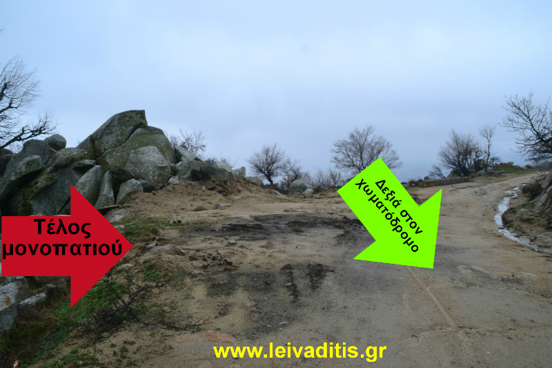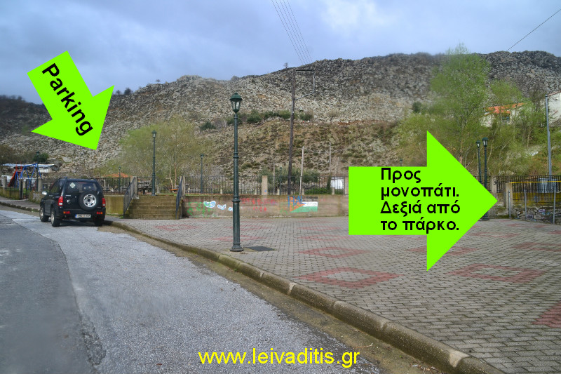 Αφού στρίψετε, ακολουθείτε τον δρόμο για άλλα 500 μέτρα και θα συναντήσετε παιδική χαρά στο δεξί σας χέρι, που είναι το σημείο όπου θα αφήσετε και το αυτοκίνητό σας. Από την πόρτα της παιδικής χαράς (δεξιά) υπάρχει γεφυράκι, το οποίο πρέπει να περάσετε για να αρχίσετε να ανηφορίζετε και να βγείτε από τα τελευταία σπίτια του χωριού και να ξεκινήσει έτσι η περιπέτειά σας, προς την κορυφή.