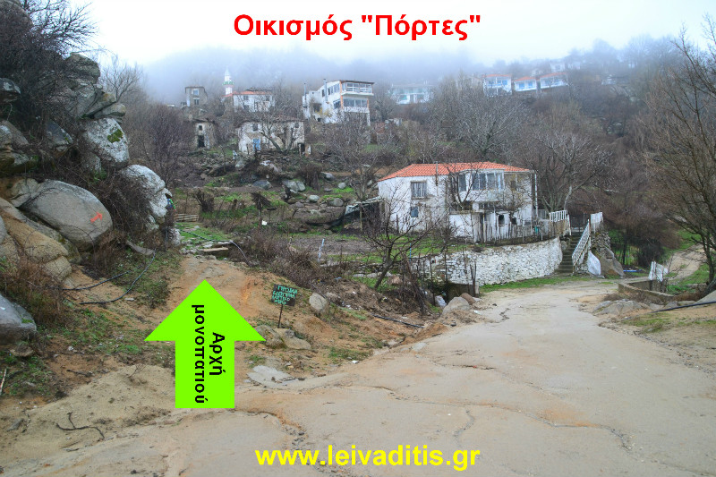 Επομένως σε 2,5 ώρες έχετε περπατήσει 5 χιλιόμετρα, έχετε περάσει ήδη μια κορυφή στα 554 μέτρα και βρίσκεστε στον οικισμό "Πόρτες" σε υψόμετρο 700 μέτρων. Χαρακτηριστική είναι η ταμπέλα στην αρχή του μονοπατιού. Αν την είδατε είσαστε στο σωστό μέρος τη σωστή ώρα.