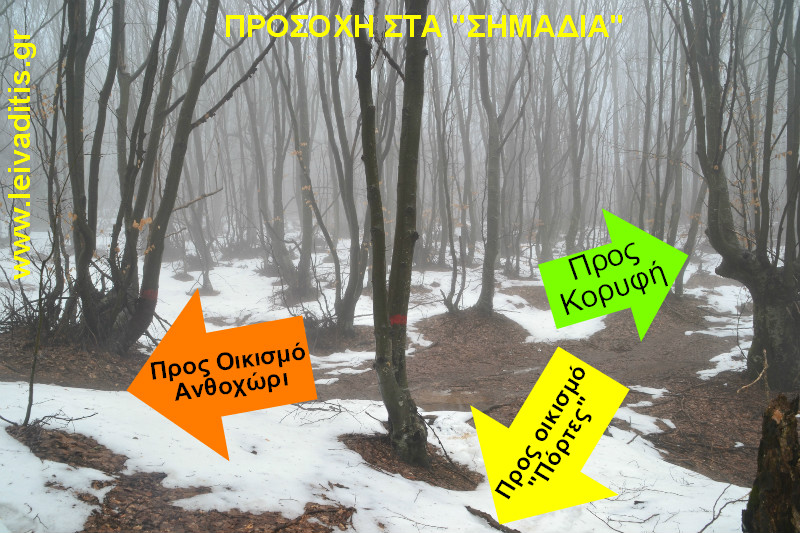 Να επισημάνουμε ότι την διαδρομή την περπατήσαμε την Κυριακή 29 Μαρτίου 2015 και την ίδια μέρα συλλέξαμε όλες αυτές τις πληροφορίες που αναφέραμε, όπως επίσης και όσες φωτογραφίες συνοδεύουν την περιγραφή του μονοπατιού. Πετύχαμε όμως άσχημες καιρικές συνθήκες. Ομίχλη και βροχή ήταν η παρέα μας από τα 700 μέτρα και μετά, ενώ όσο ανεβαίναμε προς κορυφή το χιόνι έφτανε στα 30-40 εκατοστά. Άρα οι χρόνοι μας ήταν έτσι κι αλλιώς πιο αργοί από αυτούς που θα κάναμε με κανονικές καρικές συνθήκες και σίγουρα θα δείτε αρκετή διαφορά, αν ανεβείτε καλοκαιρινούς μήνες. Επειδή είμαστε υπεύθυνα άτομα, το ίδιο υπεύθυνα βλέπουμε και εσάς, που αγαπάτε τη Φύση και το περπάτημα και θέλετε να γνωρίσετε νέους τόπους και περιοχές. Θα θέλαμε, αν περπατήσετε τη συγκεκριμένη διαδρομή ή οποιαδήποτε άλλη προτείνουμε μέσα από τη σελίδα μας, να μας αναφέρετε (στο email μας Αυτή η διεύθυνση ηλεκτρονικού ταχυδρομείου προστατεύεται από τους αυτοματισμούς αποστολέων ανεπιθύμητων μηνυμάτων. Χρειάζεται να ενεργοποιήσετε τη JavaScript για να μπορέσετε να τη δείτε.) κατά πόσο είμαστε σωστοί στην περιγραφή και αν υπάρχουν ασάφειες ή λάθη, να μας πείτε που, για να διορθώσουμε αμέσως τα "κακώς κείμενα".