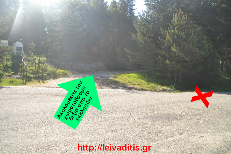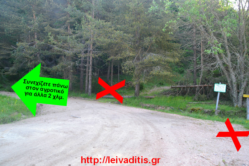 Αμέσως μετά τον Λειβαδίτη (8χλμ) φτάνετε στο Δ.Χ. Ερυμάνθου (υψόμετρο 1.315 μ.). Εκεί που τελειώνει η άσφαλτος αφήνετε το αυτοκίνητό σας και ξεκινάτε το περπάτημα. Θα δείτε στο δεξιό σας χέρι, μόλις φτάσετε ένα εκκλησάκι δεξιά του οποίου ξεκινάει ένας αγροτικός δρόμος (αν έχετε πλάτη το Δ.Χ. εκεί που θα αφήσετε το αυτοκίνητό σας, στο σημείο που τελειώνει η άσφαλτος δηλαδή κοιτάξτε απλά δεξιά σας και θα δείτε και το εκκλησάκι αλλά και τον αγροτικό δρόμο). Η σημερινή σας περιπέτεια, λοιπόν ξεκινάει από τον αγροτικό δρόμο.