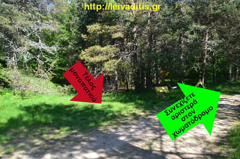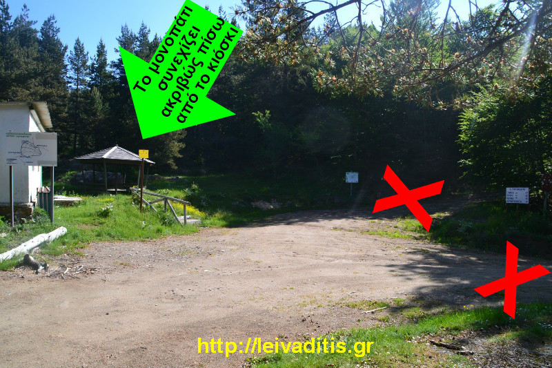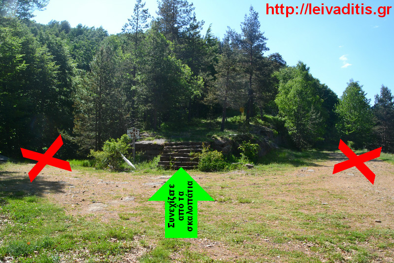 Στα 700 περίπου μέτρα πάνω στον αγροτικό δρόμο και σε υψόμετρο 1.365 μέτρων, θα συναντήσετε διασταύρωση και δύο δέντρα στα οποία υπάρχουν κόκκινα σημάδια, ενώ λίγο πιο μέσα θα διακρίνετε την ύπαρξη άσπρου κτηρίου (πρόκειται για δεξαμενή από την οποία υδροδοτείται το δασικό χωριό). Δεν θα ακολουθήσετε το μονοπάτι που ξεκινάει από αυτό το σημείο, γιατί θα σας οδηγήσει στην κορυφή της Χαιντού.