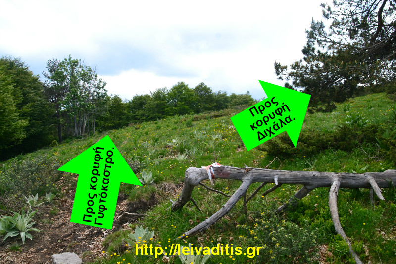 Από την ώρα που τελειώνει η ανηφόρα μέχρι που να φτάσετε δίπλα από την κορυφή της "Τσίχλας" θέλετε περίπου άλλο 1 χιλιόμετρο και 460 μέτρα σε 30 λεπτά και θα βρεθείτε σε υψόμετρο 1.730 μέτρων. Πεσμένο δέντρο με ταινία σήμανσης επάνω του θα σας δείξει ότι φτάσατε στην διασταύρωση για τις δύο κορυφές. Εσείς συνεχίζετε να περπατάτε ακολουθώντας αριστερή διαδρομή και βλέποντας σύντομα κόκκινα σημάδια πάνω στα δέντρα.