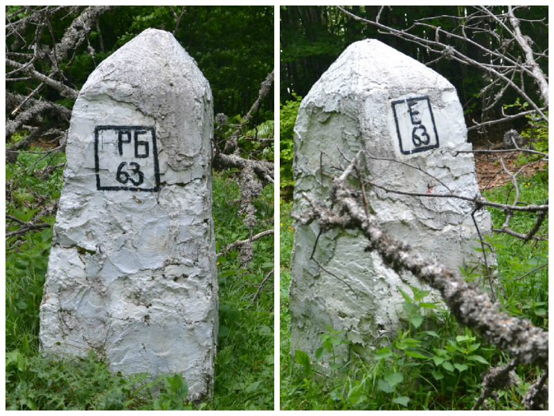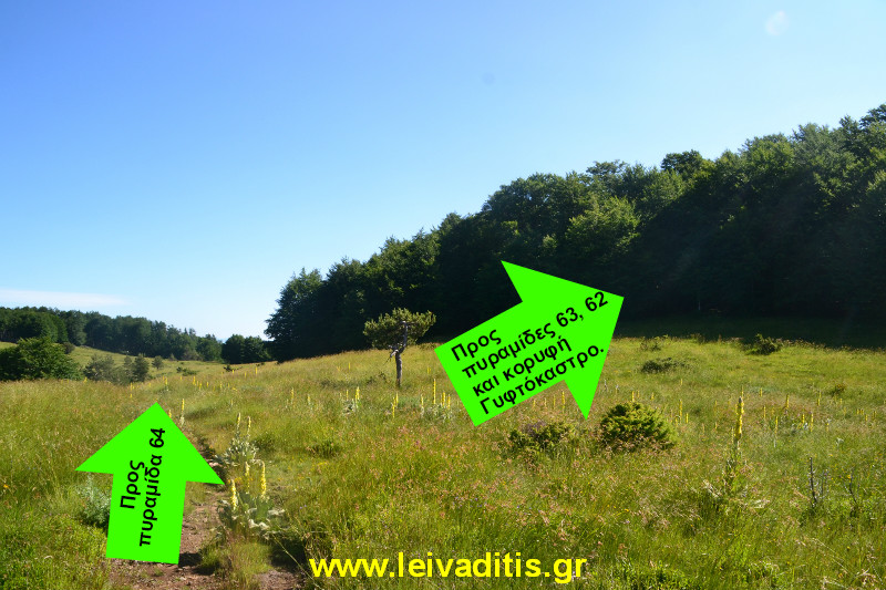 Ένα δυο λεπτά περπατήματος μέσα στο δασάκι και έχετε φτάσει στην πρώτη χαρακτηριστική πυραμίδα με το νούμερο 63. Μάλιστα η αρίθμηση και τα χαρακτηριστικά των χωρών υπάρχουν ακόμη στην συγκεκριμένη πυραμίδα υποδυκνείοντας σε ποιά πλευρά είναι η χώρα μας, η ΕΛΛΑΔΑ και σε ποιά η Βουλγαρία. Είστε ήδη σε υψόμετρο 1.715 μέτρων.