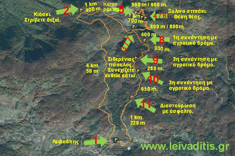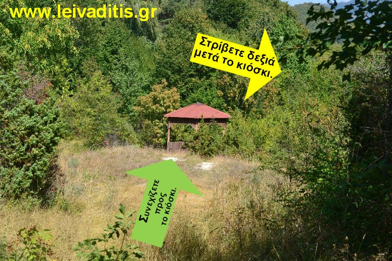Ο παράδρομος αυτός οδηγεί σε αγροτικό δρόμο ο οποίος θα σας οδηγήσει έξω από τον οικισμό του Λειβαδίτη. Τον ακολουθείτε για 4 χιλιόμετρα (περίπου 50 λεπτά) και στο τέλος του, θα σας οδηγήσει σε ένα κιόσκι (υψόμετρο 1.080 μέτρα). Δώστε ιδιαίτερη βαρύτητα σε αυτό το σημείο για τον απλούστατο λόγο, ότι ακριβώς από μπροστά του υπάρχει μονοπάτι το οποίο και θα ακολουθήσετε. Σ Ε Κ Α Μ Ι Α Π Ε Ρ Ι Π Τ Ω Σ Η Δ Ε Ν Σ Τ Ρ Ι Β Ε Τ Ε Α Ρ Ι Σ Τ Ε Ρ Α Γ Ι Α Τ Ι Θ Α Κ Α Τ Α Λ Η Ξ Ε Τ Ε Σ Τ Ο Τ Ρ Α Χ Ω Ν Ι Τ Η Σ Δ Ρ Α Μ Α Σ. Μόλις φτάσετε στο κιόσκι Σ Τ Ρ Ι Β Ε Τ Ε Δ Ε Ξ Ι Α για να φτάσετε στον προορισμό σας που δεν είναι άλλος από τον καταρράκτη.