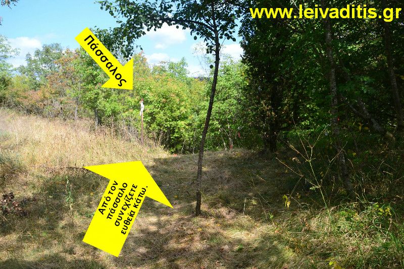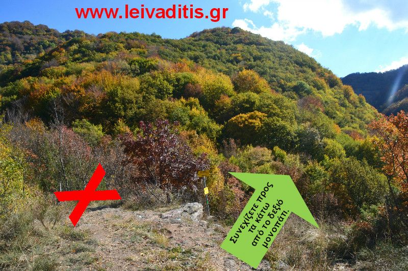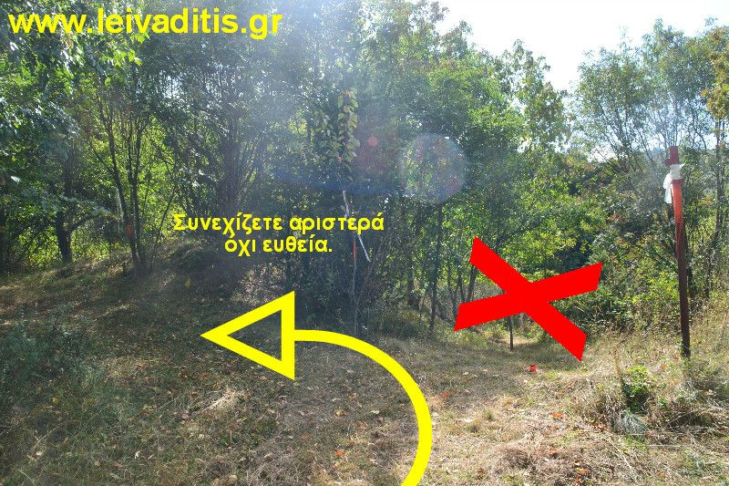 Μόλις στρίψετε λοπόν, το μονοπάτι είναι ευδιάκριτο, θα αρχίσετε να βλέπετε σημάδια από έναν μαραθώνιο αγώνα που γίνεται στην περιοχή. Ακολουθείτε το μονοπάτι και τα σημάδια για περίπου 1 χιλιόμετρο και 400 μέτρα (περίπου 25 λεπτά) οπότε θα φτάσετε σε ένα σημείο που το μονοπάτι που ακολουθείτε, ενώνεται με το μεγάλο μονοπάτι που ξεκινάει από το χωριό του Λειβαδίτη κι είναι μέρος του Διεθνούς μονοπατιού Ε6. Το σημείο αυτό της ένωσης των δύο μονοπατιών θα το καταλάβετε και από έναν σιδερένιο πάσαλο (υψόμετρο 1.005 μέτρα) που υπάρχει σε εκείνο ακριβώς το σημείο.