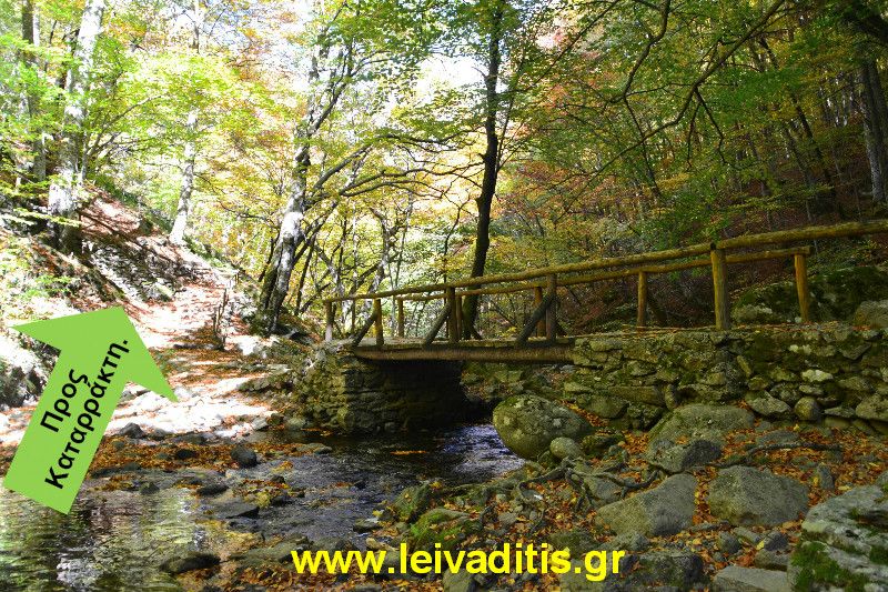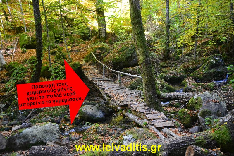 Από τον πάσσαλο συνεχίζετε ευθεία κάτω την κατηφόρα και ακολουθείτε το μονοπάτι για περίπου 450 μέτρα (10 λεπτά) οπότε και φτάνετε σε ένα ξύλινο, πρόχειρα κατασκευασμένο, γεφυράκι σε υψόμετρο 965 μέτρων. Προσοχή όταν θα το περνάτε αν είστε μεγάλη παρέα να περνάει ένας ένας και να περπατάτε στην μέση της γέφυρας γιατί όπως είπαμε είναι πρόχειρα κατασκευασμένη και κινδυνεύετε αν δεν προσέχετε.