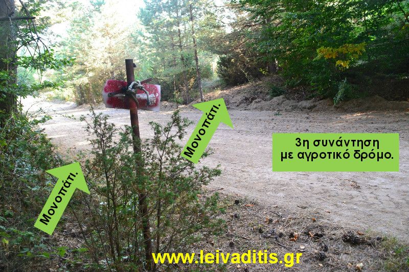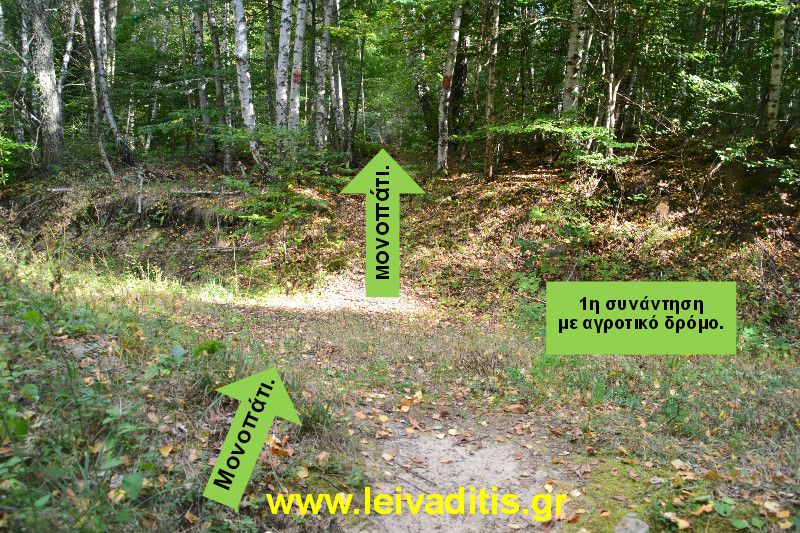 Μετά από 400 μέτρα (15 λεπτά περίπου) και λίγο πιο ψηλά, σε υψόμετρο 1.090 μέτρων, θα συναντήσετε για πρώτη φορά αγροτικό δρόμο που δημιουργήθηκε από το Δασαρχείο, για να εξυπηρετεί ανάγκες υλοτόμων. Τον διασχίζετε κάθετα και συνεχίζετε ακριβώς απέναντι του, για να βρείτε το μονοπάτι.