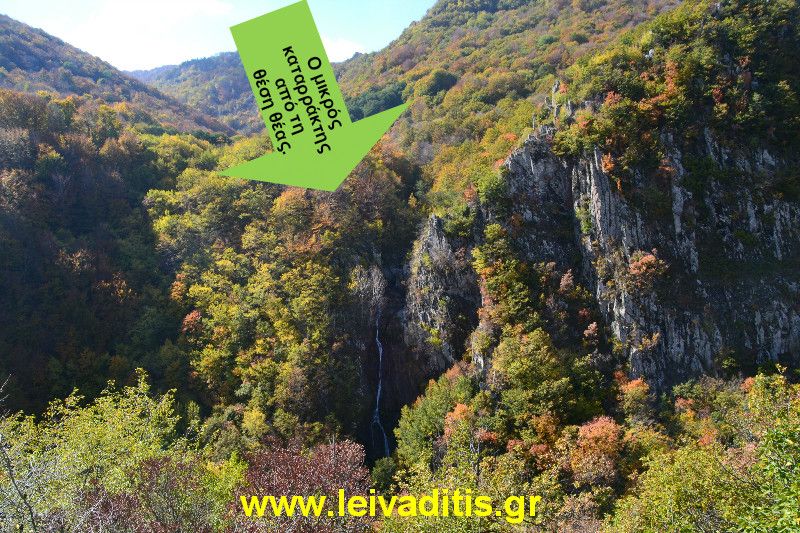 120 μέτρα μετά το ξύλινο σπιτάκι θα συναντήσετε μια μικρή διασταύρωση. Το μονοπάτι κανονικά κατεβαίνει δεξιά. Μπορείτε όμως να προτιμήσετε να ακολούθησετε το μικρό μονοπατάκι που υπάρχει μπροστά σας το οποίο θα σας οδηγήσει σε κάτι βράχια. Ακριβώς δίπλα από τα βράχια υπάρχει μονοπατάκι το οποίο μετά από μερικά μέτρα θα σας οδηγήσει σε φανταστική θέση θέας από την οποία μπορείτε να δείτε έναν μικρότερο καταρράκτη καθώς και τα βουνά της Δράμας. Ο μικρός αυτός καταρράκτης σχηματίζεται από τα νερά που ξεκινούν από τον οικισμό του Λειβαδίτη και στο σημείο που "χύνεται" ενώνεται με τα νερά του "Στραβορέματος" άλλο "ρέμα" που έρχεται από τα βουνά της περιοχής των Ελληνοβουλγαρικών συνόρων (Γυφτόκαστρο).