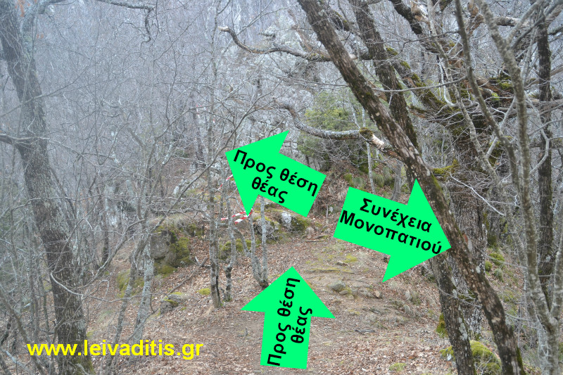 Αφού περπατήσετε άλλα 100 μέτρα περίπου (μετά το σπιτάκι), συναντάτε ένα βράχο, δίπλα από τον οποίο ξεκινάει ανηφορικό μονοπατάκι για λίγα μέτρα και σας οδηγεί σε μια ωραία θέση θέας (υψόμετρο 990 μ.).