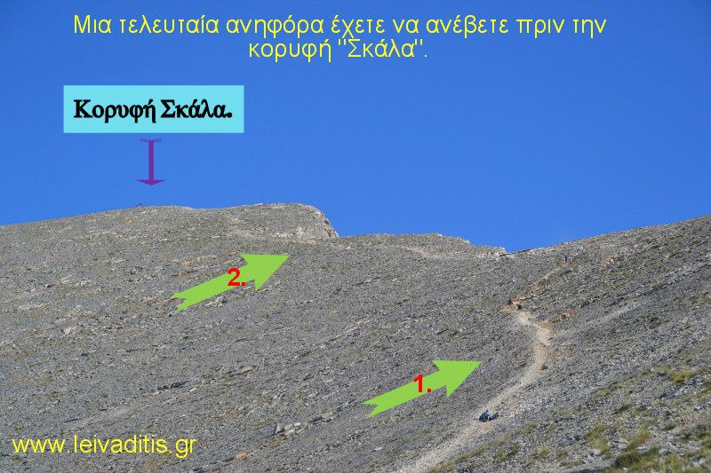 Είστε λοιπόν στην κορυφή "Σκάλα" Για μας είναι ένα σημείο στρατηγικής σημασίας διότι η διαδρομή από δω και πέρα είναι λιγάκι δύσκολη διότι κινείστε αποκλειστικά πάνω σε βράχια.Αυτός είναι και ο λόγος που έχουμε σπάσει την διαδρομή και σας την δίνουμε ως ξεχωριστό τμήμα: