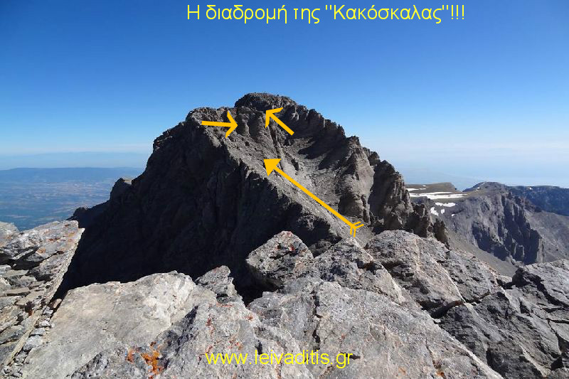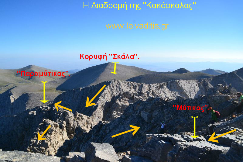 Για να σας εξηγήσουμε καλύτερα την παραπάνω εικόνα θα σας κάνουμε μια μικρή "ραδιοφωνική" περιγραφή... Είστε έτοιμοι? Πάμε λοιπόν... Αριστερά από τη κορυφή της "Σκάλας" θα μπείτε σε ένα μικρό λούκι για 20 μέτρα περίπου το οποίο θα σας οδηγήσει στην πλαγιά που είναι ακριβώς κάτω από την κορυφογραμμή της "Σκάλας". Ακολουθώντας προσεκτικά τα σημάδια που υπάρχουν πάνω στις πέτρες θα κατέβετε περίπου 70 υψομετρικά μέτρα οπότε και θα ισιώσει η διαδρομή, η οποία θα σας οδηγήσει στην βάση μιας μεγάλης πλαγιάς. Την πλαγιά αυτή (περίπου 90 υψομετρικά) θα χρειαστεί να την ανέβετε και μόλις φτάσετε στο τέρμα της θα κινηθείτε λίγο δεξιά οπότε και θα φτάσετε στον "Παραμύτικα". Από τον "Παραμύτικα" θα κατέβετε μερικά μέτρα και θα κινηθείτε αριστερά ακριβώς κάτω από την κορυφή την οποία θα χρειαστείτε άλλα 20 υψομετρικά για να φτάσετε (Εικόνα 10)...