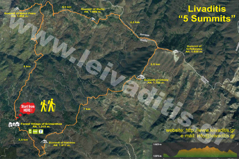 - Η έναρξη και ο τερματισμός γίνεται από το"Δασικό Χωριό Ερυμάνθου" σε υψόμετρο 1.315 μέτρων.