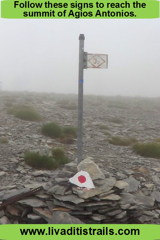 Let’s go back to the narrative. Next on our schedule today is a third summit, Agios Antonios. From Skolio you will notice a path descending straight ahead and which you must follow. At a certain point, you will come across metal columns with O2 signs on them. If the weather is good, the path will be clearly visible. But, if the weather if foggy or rainy, you will have to be very careful to follow these signs to reach the summit (Image 12)…