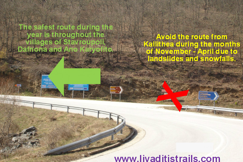 Starting from the city of Xanthi, which is located in the North - Eastern Greece you could follow the road to the small town of Stavroupoli and then after passing the villages of Dafnona and Ano Karyofito you end up, after a distance of 48 km in the mountain village of Livaditi at an altitude of 1,250 meters. While you are on your way to Stavroupoli and more specifically at the height of Lykodromio at an altitude of 285 meters, you will notice that there is a right junction, which ends up in the village of Livaditi through Kallithea. It is advisable to avoid this route during the months of November to April, because due to frequent snowfalls the route closes and it is difficult to get to your destination (this road is of minor importance and during the winter season snow removal equipment is not available). Also, there is no telephone signal all the way, just on a few points. This particular route is far more pleasant to be followed during the other months, from May to October (Picture 1).