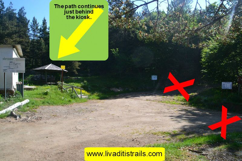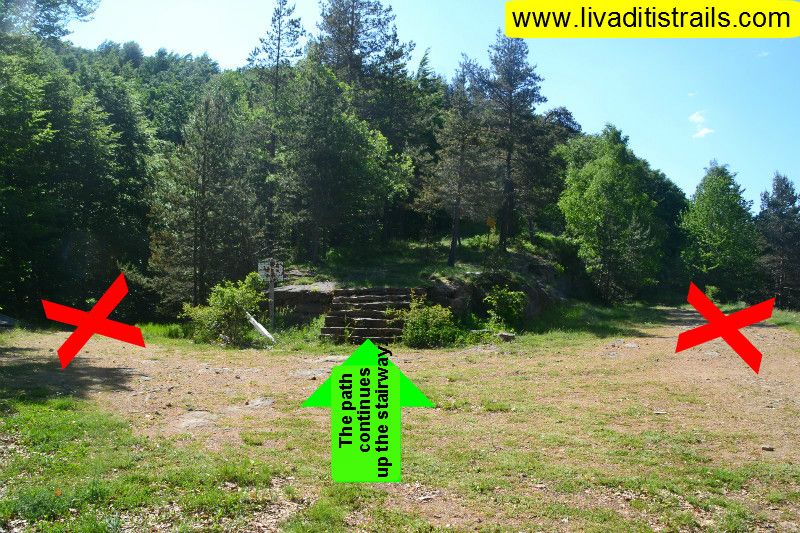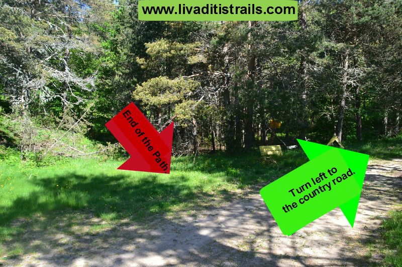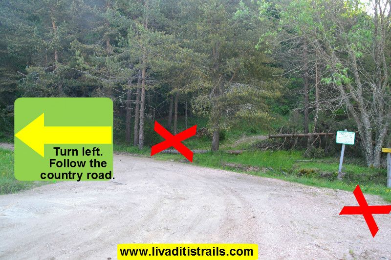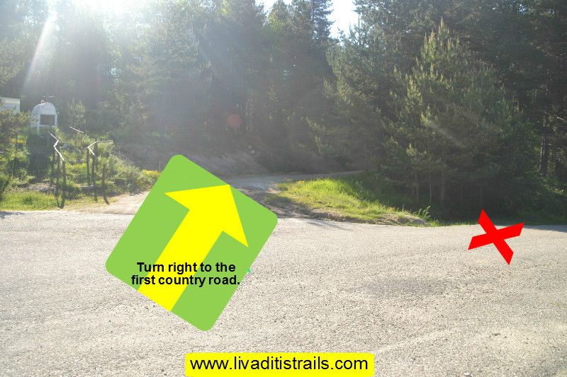 After walking about 700 meters on the country road, at an altitude of 1.365 meters, you will find a crossroad and two trees, on which there are red sings. A little further down you can notice a white building (it is a water tank that provides water to the forest village). You must not follow the path that starts from this point, because it will lead you to Chaintou summit (Picture 4).