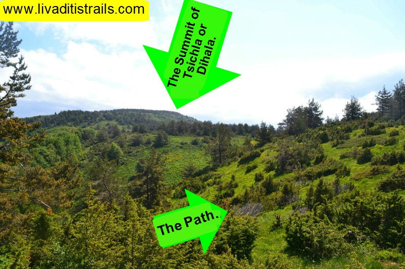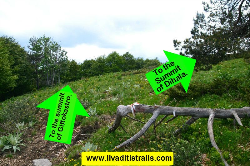 By the time the ascent ends and until you arrive to the junction to the Tsichla summit, you need to walk another 1 km and 460 meters in 30 minutes and reach an altitude of 1.730 meters. A fallen tree with a marking tape on it shows that you reached the crossroad for the two summits. You continue to walk along the left path and soon seeing red marks on the trees (Picture 9).