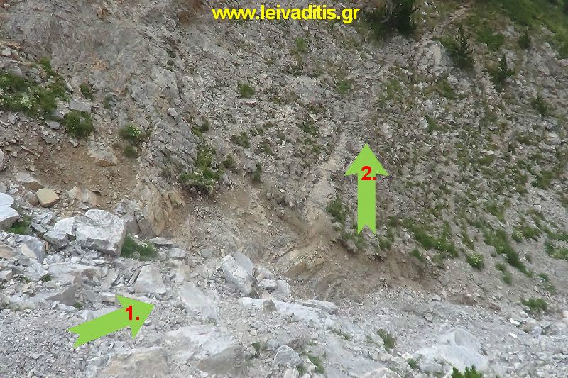 Αφού περάσετε αυτήν την άσχημη "πλαγιά" του βουνού και ενώ έχετε περπατήσει 1 χιλιόμετρο και 230 μέτρα από το καταφύγιο σε περίπου 45 λεπτά και σε υψόμετρο 2.200 μέτρα φτάνετε στο πιο δύσκολο σημείο της διαδρομής ειδικά αν ανεβαίνετε κατά τον Μάιο με Ιούνιο. Πρόκειται για ένα μεγάλο "λούκι" το οποίο κρατάει το χιόνι που πέφτει τους χειμερινούς μήνες και σας αναγκάζει να την διασχίσετε. Μπορεί να είναι καλοκαίρι μπορεί να έχει ανεβασμένη σχετικά θερμοκρασία αλλά να έχετε τον νου σας...δεν είναι εύκολο να την διασχίσετε ειδικά αν δεν έχετε εμπειρία στα βουνά (Εικόνα 4)...